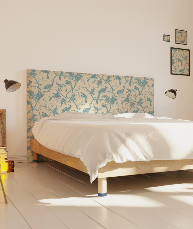 Ces différents oiseaux sur des branchages dont la finesse des contours était obtenue par l’impression à la plaque de cuivre gravée en taille douce, apparaissent au milieu du XVIIIe siècle lorsque les manufactures anglaises transposent le procédé de l’estampe pour imprimer sur tissu. Cette composition a été imprimée par une fabrique alsacienne en 1864, elle reprend un modèle plus ancien, témoignant de la permanence de ces motifs dans les arts décoratifs depuis le XVIIIe siècle et qui aujourd’hui encore donnent un caractère charmant aux intérieurs. Une nouvelle vie pour cet imprimé qui sublimera avec élégance l'apparence de votre lit.