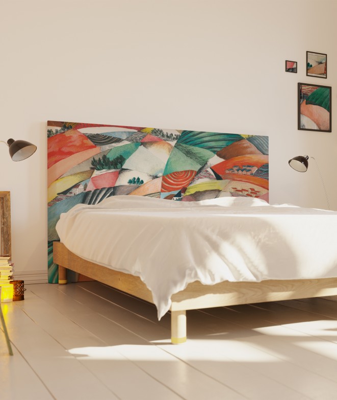 Endormez-vous au coeur d'un paysage vallonné haut en couleurs imaginé par l'artiste Axelle Grosperrin. Une création originale créée spécialement sur un support inédit : la tête de lit ! Nos têtes de lit décorées par des artistes habillent avec élégance votre literie tout en vous offrant un confort inégalable grâce à leur dossier matelassé. Garnis d'une mousse ultra-moelleuse, nos modèles vous apporteront bien-être et relaxation pour bouquiner, regarder vos séries télé ou papoter jusqu'au bout de la nuit. Le saviez-vous ? Notre collection de têtes de lit a pour particularité d'être déhoussable pour changer l'ambiance de votre chambre au gré de vos envies !