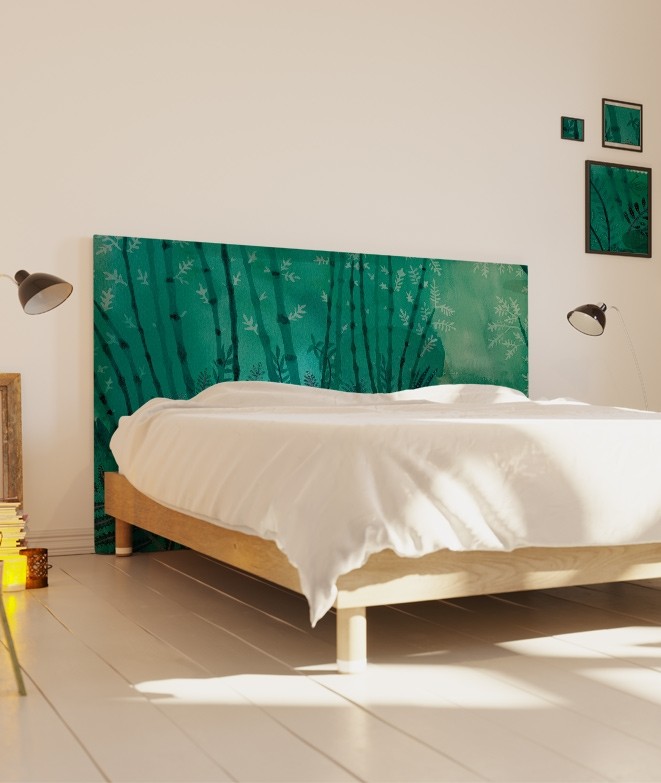 Des fougères en spirale, une feuille d'acacia, de noyer, de ficus, et une forêt de bambou ! Mes motifs sont inspirés du monde végétal d'ici et d'ailleurs. C'est l'occasion de recréer un petit cocon de nature dans son habitat, au cœur même de son intimité, près du lit.