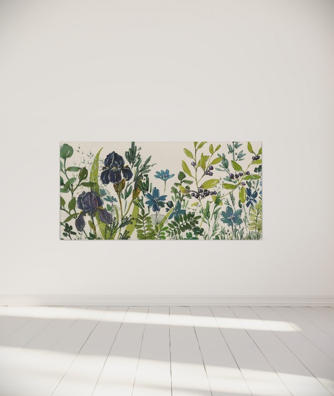Offrez-vous une balade champêtre au milieu des iris avec cette composition végétale immortalisée à l'aquarelle par l'artiste Marianne Faure Desforges.